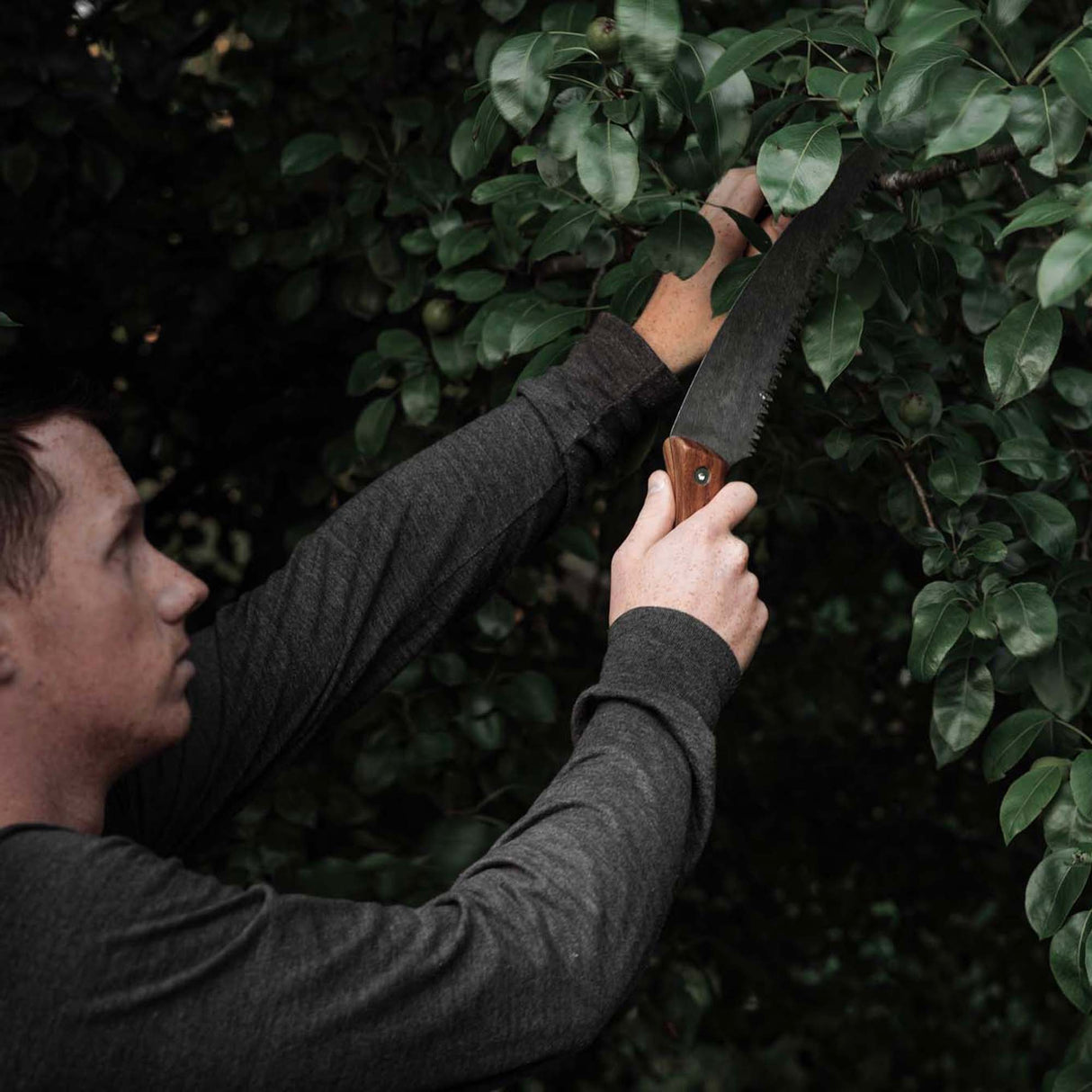 The Timber Saw provides a quick, clean approach ideal for cutting smaller pieces of wood at a campsite, cutting off branches and deadwood, and pruning trees. While traditional hand saws rely on a pull-push motion, the simple curved blade and aggressive teeth of the Timber Saw require a push-strike motion. The result is a super effective, safe, and fast cut. Ergonomic and durable walnut handle fits smoothly in your hand for perfect, even pressure and pulling strokes.